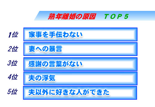 戻ってこない時間を、さらに未来のために犠牲にし、嫌いな人間と暮らすことを決める。できる人とできない人がいるのでしょうが、統計的に熟年離婚が増えているのは、できる人もかなり多いことを示しているのでしょうね。あるいは、ご主人が退職するまでは、本当に心から感謝していたのかもしれないし、人生なんてこんなもんだと少し諦めもあったのかもしれませんが、いっしょに居る時間が多くなってから「とても耐えられない」と堪忍袋の緒が切れたのかもしれません。