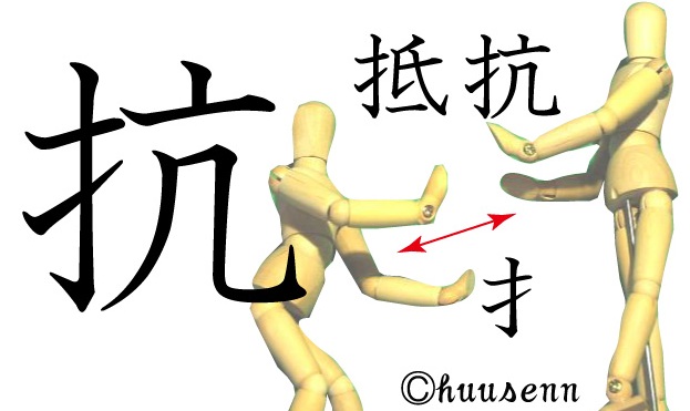 抵抗:(1)外から加えられる力に逆らったり、張り合ったりすること。手向かうこと。さからうこと。 (2)そのまま素直には受け入れがたい感じ。反発したい感じ。抵抗感。(3)運動する物体に対し、運動と反対の方向に作用する力。抗力。