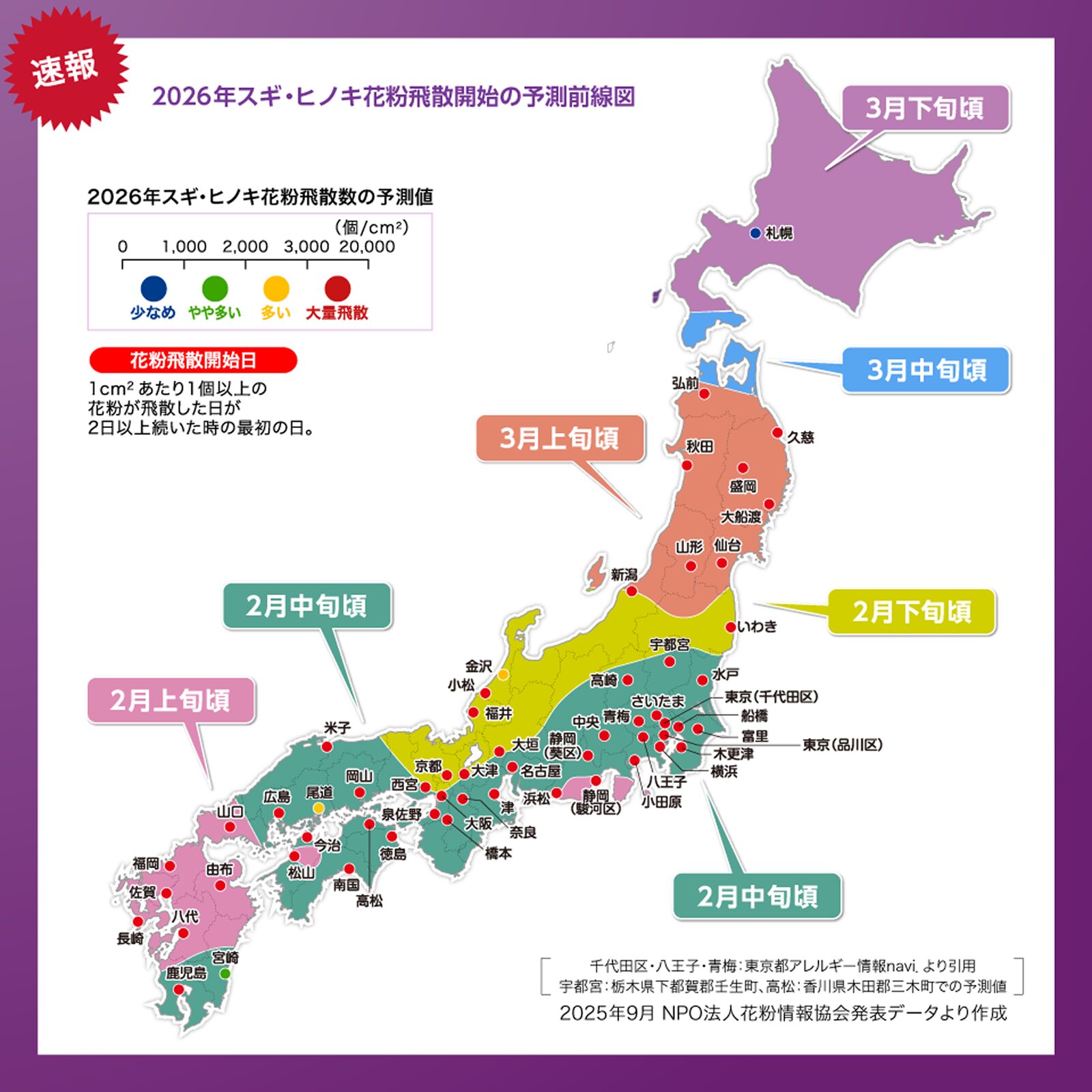 飛散開始: 2月上旬から九州・東海・関東の一部で始まり、2月中旬にかけて中国・近畿へと広がります。