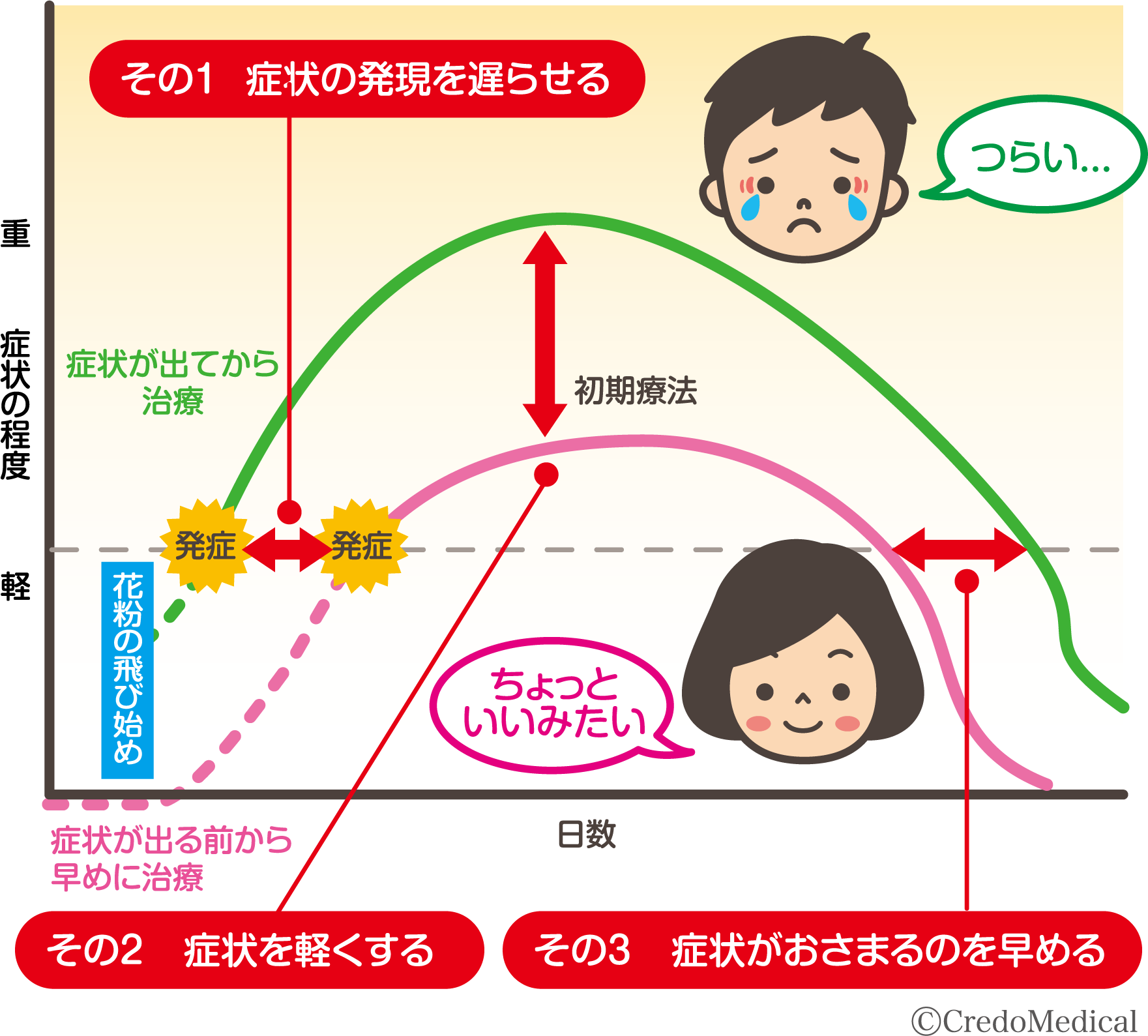 対策のタイミング: 2月上旬の飛散開始に備え、1月中旬〜下旬には医療機関の受診や薬の服用を開始するのが良いでしょう。