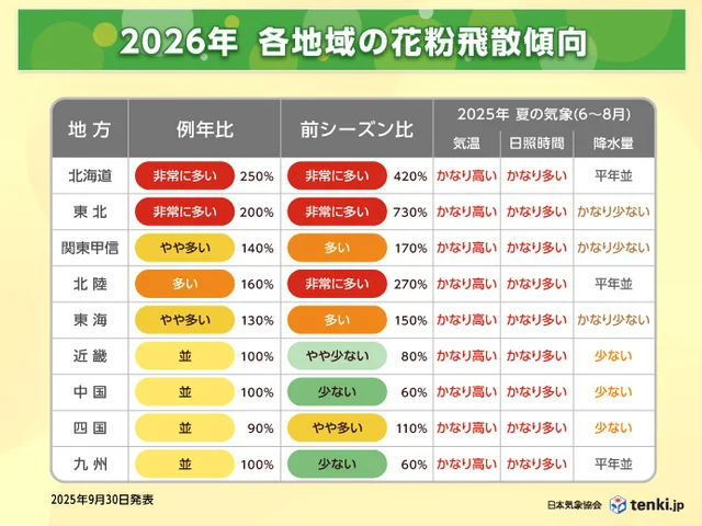 飛散量: 全国的に平年並みかそれ以上と予測され、特に東日本や北日本では前シーズンより多い傾向にあります。