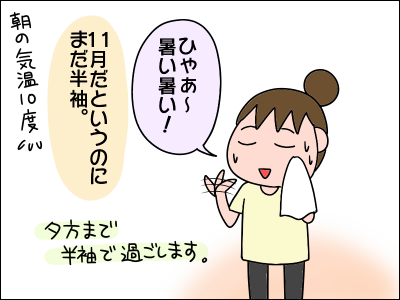 とはいえ 11月になっても半袖にジャケットということが多いです。 暖房入れ始めの頃は私にとってはまだ暑く感じることが多くて、室温は18°cから20°cくらいが一番頭が働くので・・・。寒いのが我慢できるんですが(着ればいいから)暑いのは エアコン だより、あるいは水に近いシャワーだより です(笑)。