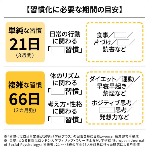 - 可視化とその準備の入念さ:持ち物や生活習慣に必要なツールや刺激を目につくところにしっかり装備し、それをどのようにどのくらいの長さで行うかなどを事前に詰めておく