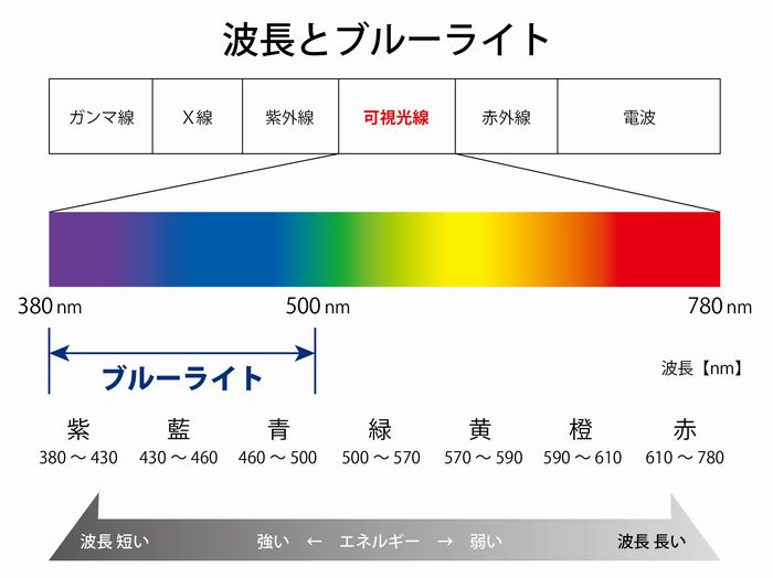 ここに詳しく書いてありました。ブルーライトは紫外線に一番近い光だそうです。体に起きる症状としては目の疲れ、網膜へのダメージや睡眠の質を下げてしまうようですね…。寝る前にスマホはいじらない方が良いってよく言いますもんね。こういうところからもきているんですね。