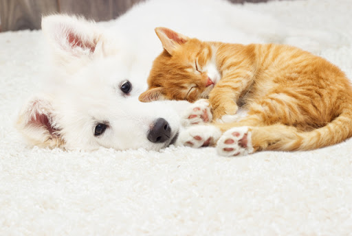 Berger Blanc Suisse puppy and kitten fluffy carpet