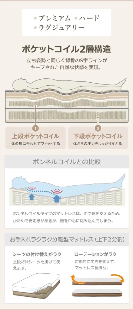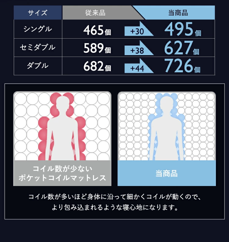 ポケットコイルマットレスは安かったせいなのか、混み込みじゃなくて、少しまばらで数が少ないのかなぁ。