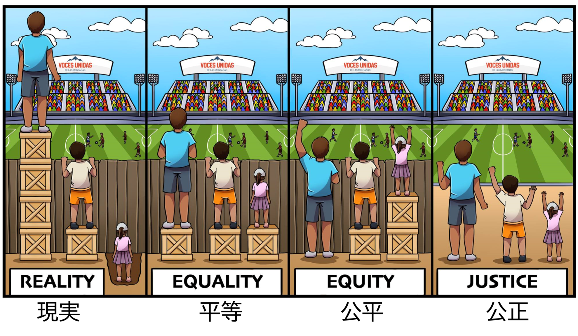 公平:判断や行動に偏りがなく、えこひいきをしないことで、特に個々の状況や能力、努力の違いを考慮し、それぞれに見合った条件や支援を提供して、結果として公正で納得できる状態を目指す概念