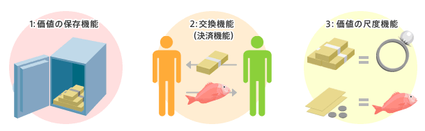 交換機能: お金は物々交換の「仲立ち」をします。Aさんが欲しいものとBさんが要らない、あるいは過剰に持っているから売りたい・何かと交換したいというものがたとえぴったりとマッチしていなくても、お金があればそれが仲立ちとなり、一時的な交換が成立します。
