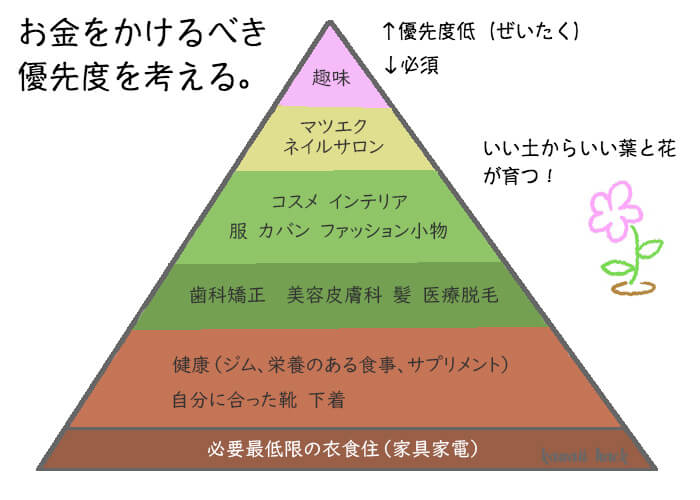 多くの人々は、ベーシックな「生き延びられるための質素な生活」からどんどん贅沢や便利の追求を重ねていくために、お金の優先順位は高くなっていくようです。