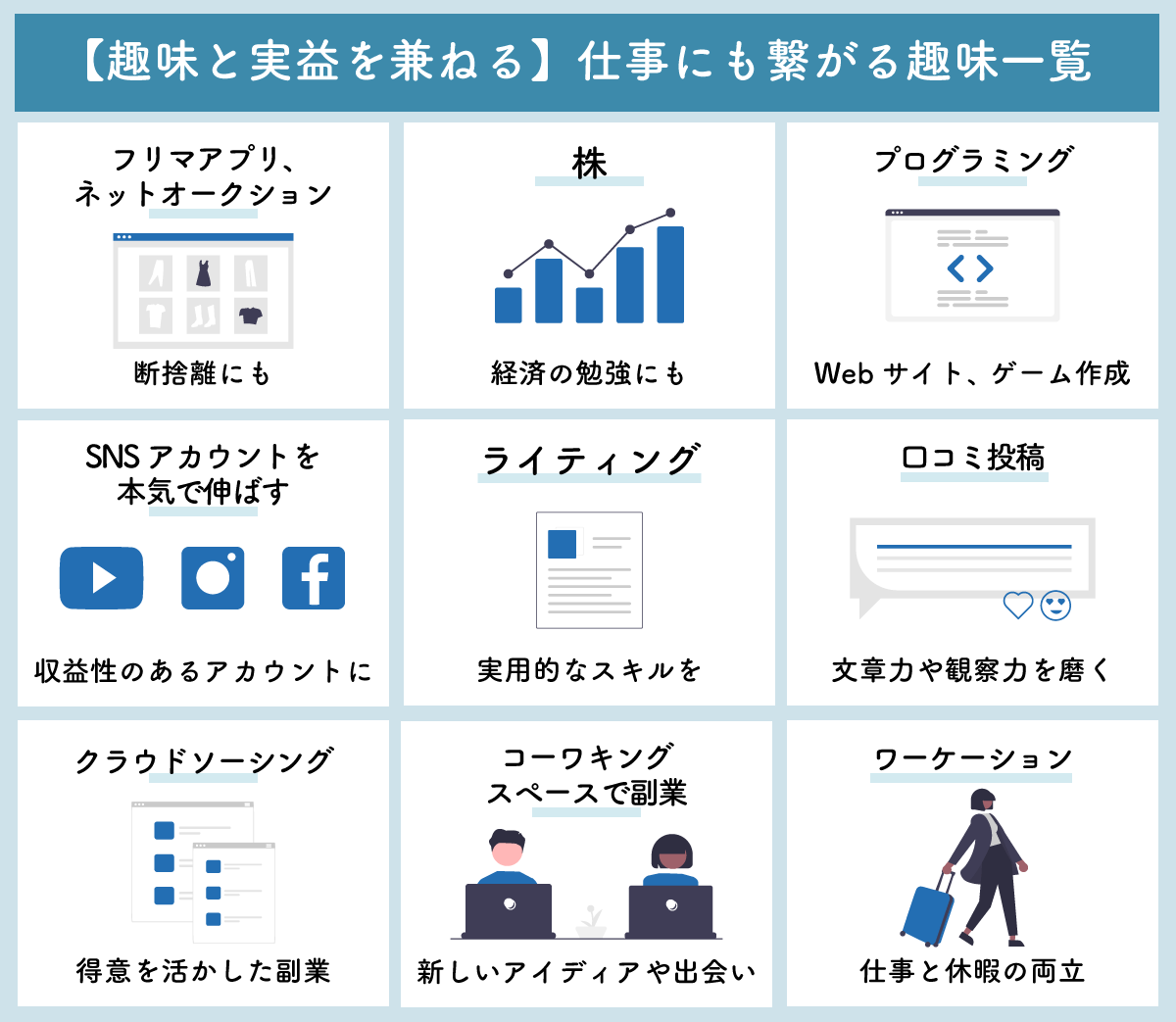 - スキルアップ: 語学、プログラミング、楽器演奏。