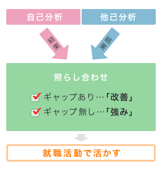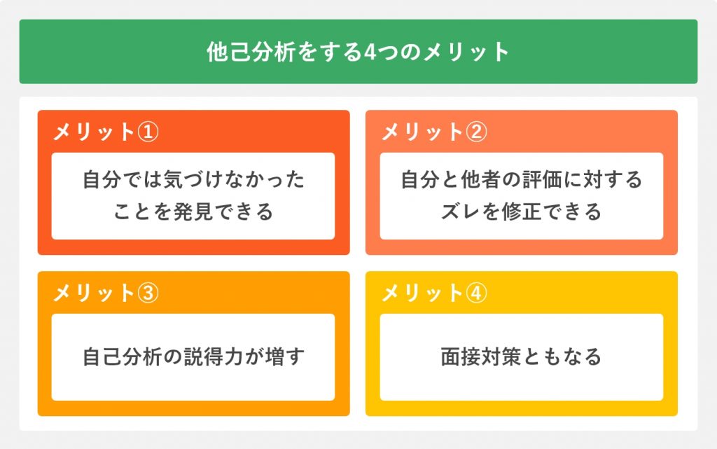 他己評価:他人から見た自分に対して評価を受けることです。 自己評価が自分自身と向き合って評価をするのに対して、自分では無い他人から評価を受けるもので、自分では気づけないことに対しても評価をされ、改善をしていく手助けになる。