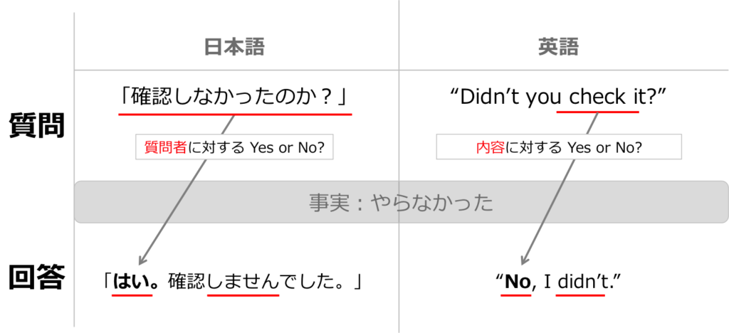 「うん、そうだよ」はまだいいんですが、「ううん、そうだよ」という日本語が存在するため、No, I am/I do.が横行してしまうことになる(笑)。だが、英語にはそれは存在しない・・・。