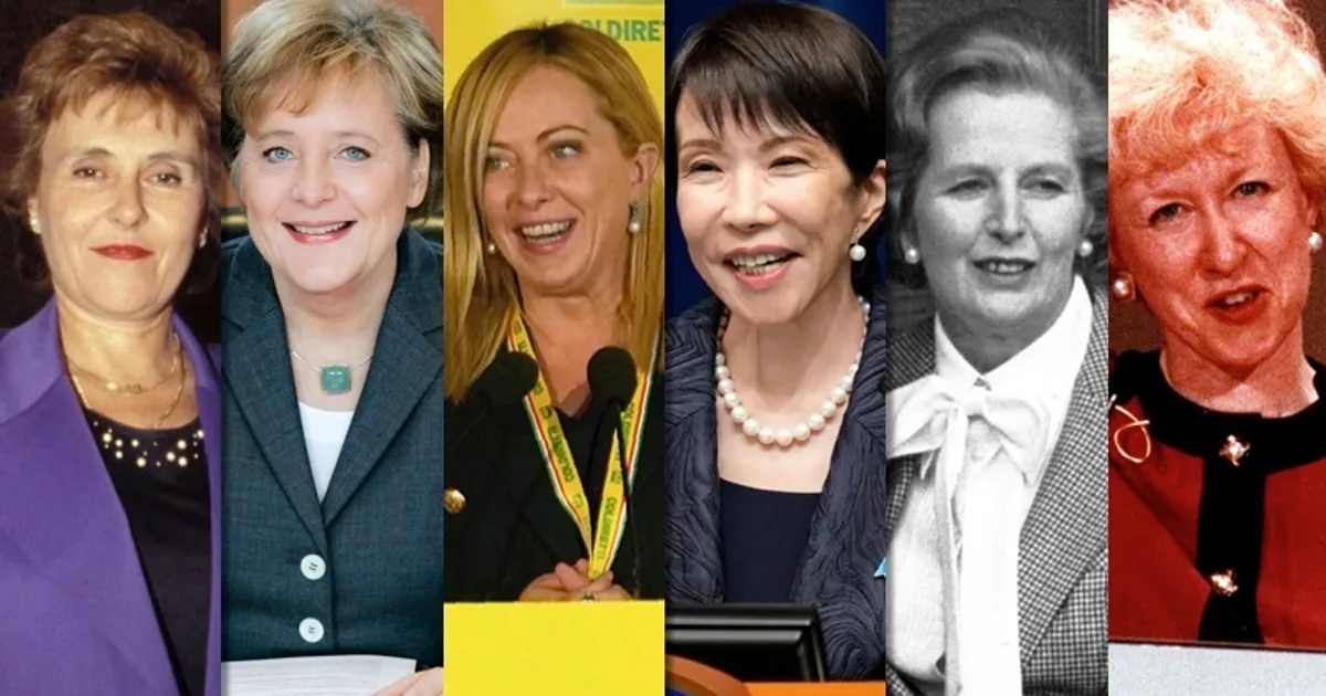 著名な女性リーダー: インディラ・ガンジー (インド, 1966年)、マーガレット・サッチャー (英, 1979年)、ベナジル・ブット (パキスタン, イスラム圏初, 1988年)、アンゲラ・メルケル (独, 2005年)。