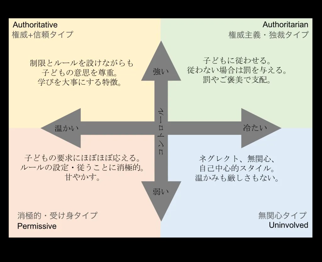 子育てのスタイル:Parenting styleというのは大まかに分けて4つあるとされており、この基本的な4つのスタイルをどんどん細分類化したものが、現代の私たちには提供されています。昨今では ”helicopter parent” などと呼ばれるものがあり、それがどのカテゴリーから派生したものかわからない人が多いです。日本語でも毒親などと言われていますが、この基本の4つのどこに当たるのか?は、示されていないことが多いため、単に「毒親」という言葉がどんどん前面に出てきます。