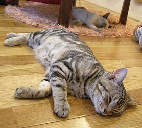 最近は暑いので、お布団が熱い!茣蓙の上で寝ています。エアコンが必要なときも開けて眠れるときも同じで、きっと肌寒くなるまではきっと布団をしっかり敷かないのかもしれない・・・。ネコたちがとにかくいっしょに眠りたいと寄ってくるので、5匹がいっしょに寝そべることができる空間が、私にとって、目下イチバン!の場所になっています。もしも、またもや家を買う段になれば、きっとまたキッチンやらバスルームやらと寝言を言い出すのでしょうが、買ったとしても貧乏性は直らず、またもや荷物を置かず、コンパクトに行動範囲をひとまとめにするに違いない(爆)。私はソファを使わず、どうせなら、ベッドに寝そべってTVが見たいし、そのすぐ横に机があって、PCができて、その後ろに大きな本棚があって、4歩から10歩歩いたところにクロゼットがあり、その数歩先にバスルームがあるのがいいのだ。キッチンは多少遠くてもよく、でっかいコーヒーマシンとでっかいマグカップとグラスがあれば、特に遠いことは苦にならず・・・。