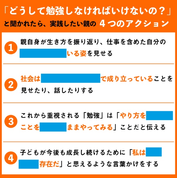 自分の体験を話してから、将来のいつか、勉強したいと思えたときに勉強できる準備だけはしてくれるようにと約束してもらっています。自分なりの賢さをいつも目指しながら大人になってほしいと。そのために勉強が必要かどうかは自分で決めていいよ、自分に戻ってくるから、とも。