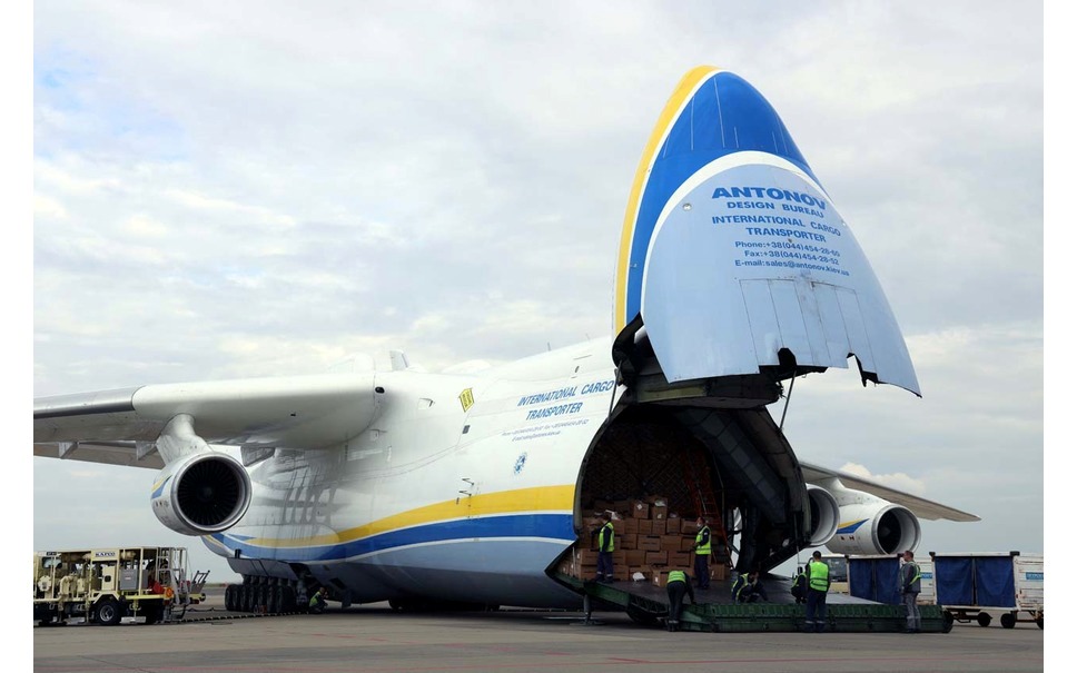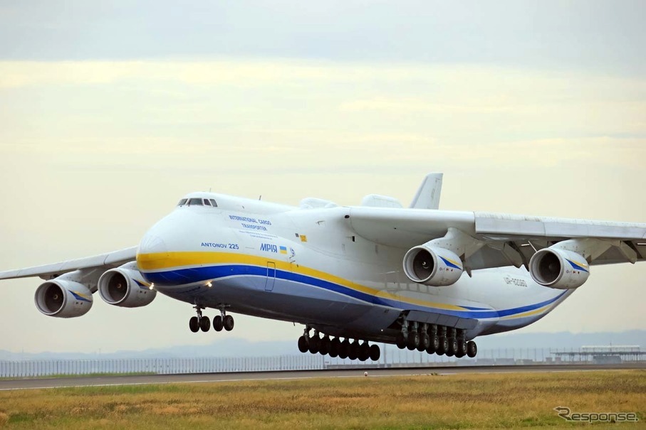 ここでアントノフとは??と思った方に説明しますね。アントノフ、正式名称An-225 ムリーヤといい、ソビエト社会主義共和国連邦に統合されていた当時のウクライナ共和国の時代に同国のアントノフ設計局が開発した飛行機です。全長84m、全幅約89m、全高約18m、最大離陸重量は640トン、貨物搭載量(ペイロード)は250トンと、現存する世界最大の飛行機です。タイヤは主降着装置7脚、合計32本もあり、エンジンは左右の翼に3個ずつ、計6個という他に例を見ない機体なんです。