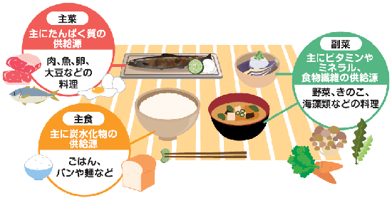 • 3食の栄養の内容を考え、バランスよく食べる