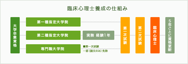 臨床心理士になるには、当協会の資格試験に合格することが必須要件となります。ただし資格試験を受けるためには、あらかじめ臨床心理士養成に関する指定大学院または専門職大学院の修了を基本モデルとする“受験資格”の取得が必要です。