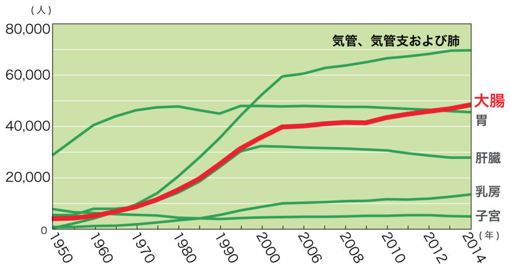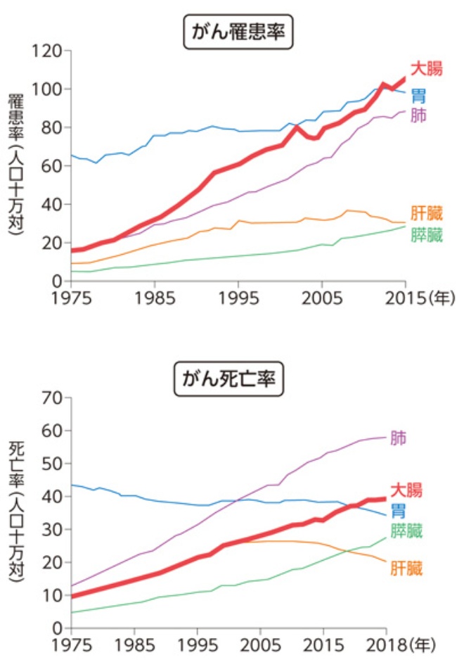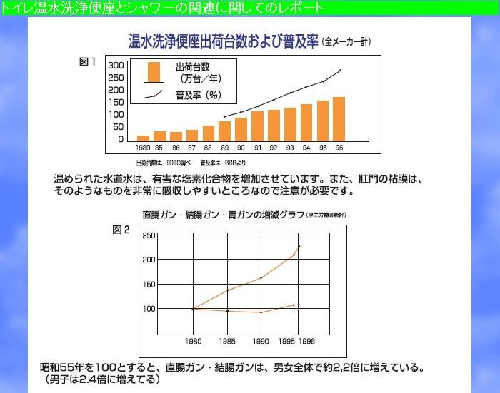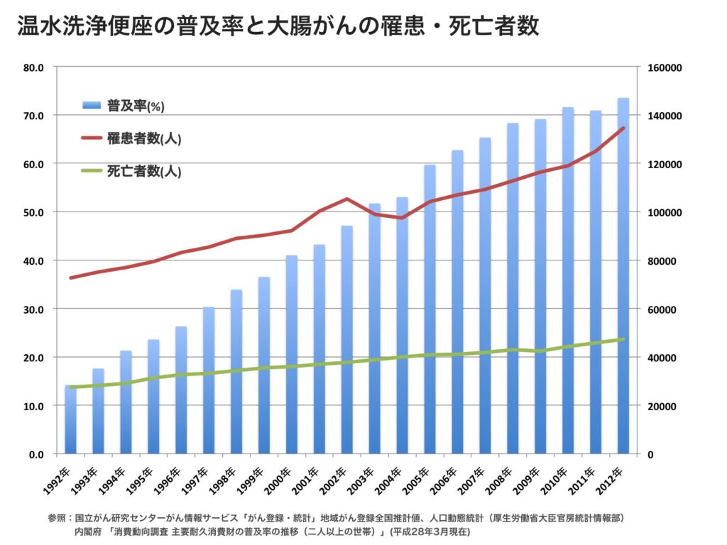 しかも これを調べている最中に少し考えなければいけないなと思ったのは、日本人女性の大腸がんの増加です。ウォシュレットが関連性があるかもしれないという論文を読んで 少し不安になりました。 私は 渡米 中20年使ってないんですが、戻ってきてからは結構使っているかもしれないと思ったからです。 最初の4-5年くらいは違和感があって使わなかったんですね。 その後 10年ちょっとぐらいは使う率が高くなったような気がします。 この統計を見ると まんざら 胡散臭い 根拠ではないので、体を柔らかくしておくとか力を維持するとか衛生概念を 保っておくためにも、毎回毎回ウォシュレットを念入りに使うのはやめようと思っています。