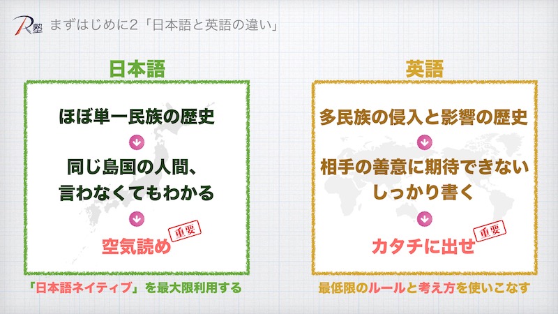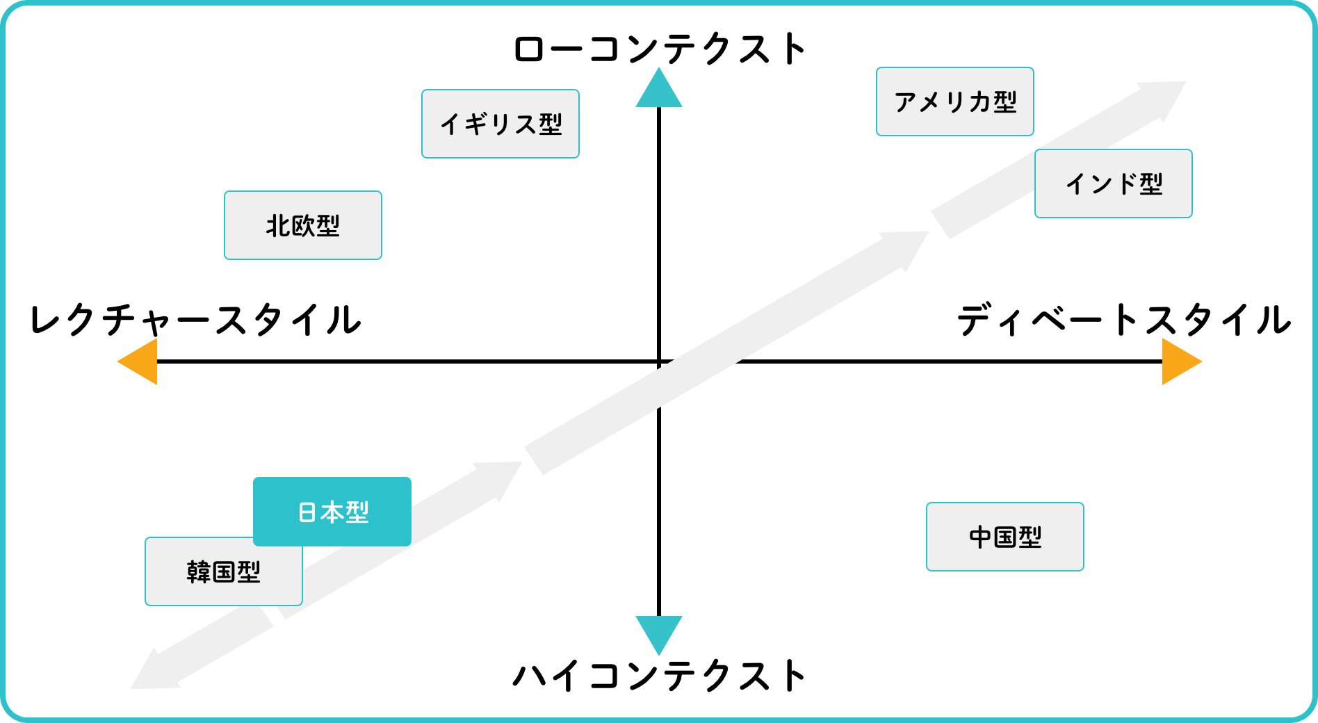 High-Low context, 狩猟民族ー農耕民族での伝達の目的の違い、原理原則としての主眼や本質の違い、社会性に対する前提の違い、個人に対する前提の違いなどなど、ポイントがいくつもあるのでそこをカバーしないと意味がないほどに果てしない学びが続く