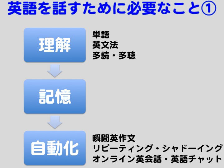 問題は何かというと、 今後も やはりDictationを推奨するような 学習法で時間うんと使い、 一つ一つの単語にひどくこだわりを持ち、 日本語 ⇔英語の 訳を常に脳内で行い、 座学をメインで勉強した気になる、という 一番最初の学習法をやめない限りは、早く英語を話すようにはなりにくいということです。