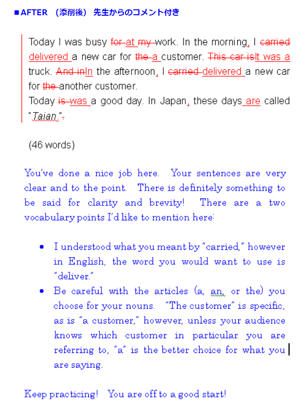 添削をかけることによって、35年以上 英語を使ってきて相当に ネイティブに近くなっているオオダイラが、 英語 らしい言い回しに直したり、 それでもいいのだけれども・・・と してから書き足したりします。 もちろん 解説は日本語です。
