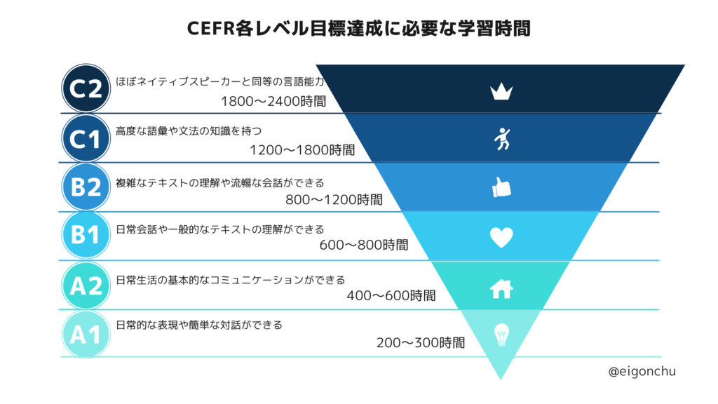 • 多くの方は中学・高校で約1,000時間ほど学習済みのため、社会人になってからさらに1,000時間〜2,000時間の積み上げが必要になるのが一つの目安です。