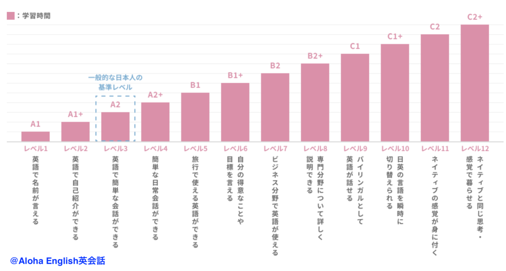 日本人はすでに中学・高校で約1,000時間程度学習しているため、そこからスムーズに話せるようになるには、追加で1,000〜2,000時間の「使える英語」の練習が必要です。