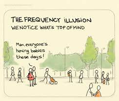 - 何度かそれ(ら)に気づくことがあれば、確証バイアスの作用により「なんだか急に目にするようになったな」という思い込みが強くなる。