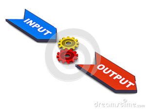 アウトプット:出力;(1)原動機・ポンプなど、機械や装置が入力を受けて、外部へ仕事として出すことのできる仕事の量。(2)機器・装置が入力を受けて仕事をし、外部に結果を出すこと。また、その結果。コンピューターが入力データを処理して、処理結果を出すなど。アウトプット。