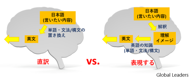 この左側の図が、日本で英語教育を受けた生徒さんたちが未だトライしてがんばろうとしていることです。このピンクの矢印は、自分の持つ英語の知識や感覚で理解している領域に、日本語でコンサルやチェックをしているところなのです。